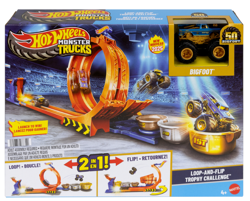 - Race and stunt with a 50th anniversary die-cast Bigfoot toy truck in the Hot Wheels Monster Trucks Loop-And-Flip Trophy Challenge playset!