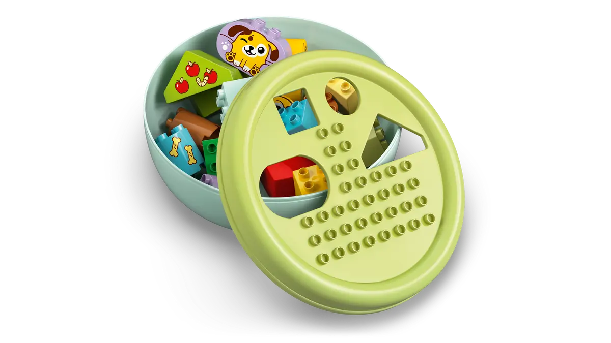 Give pooch-loving preschoolers two ways to play with the Shape Sorter: Puppy House (10441) toy. This fine motor skills toy for toddlers aged 18 months and up introduces joyful learning about shapes and problem solving as preschoolers use the bricks to build a place for their pups to play, then drop the shapes through the holes in the lid.