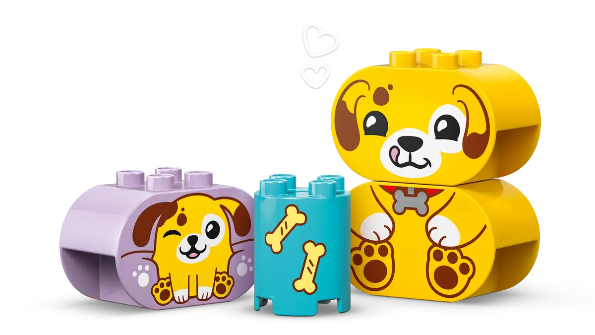 This spatial reasoning toy gift for toddlers is packed with fun family learning activities. Parents can point out all the different shapes in the set as toddlers use them to build trees, dog figures and even a house. They can then enjoy creative role play with their cute LEGO® DUPLO® dog toys, rolling a ball for them and feeding them a bone.