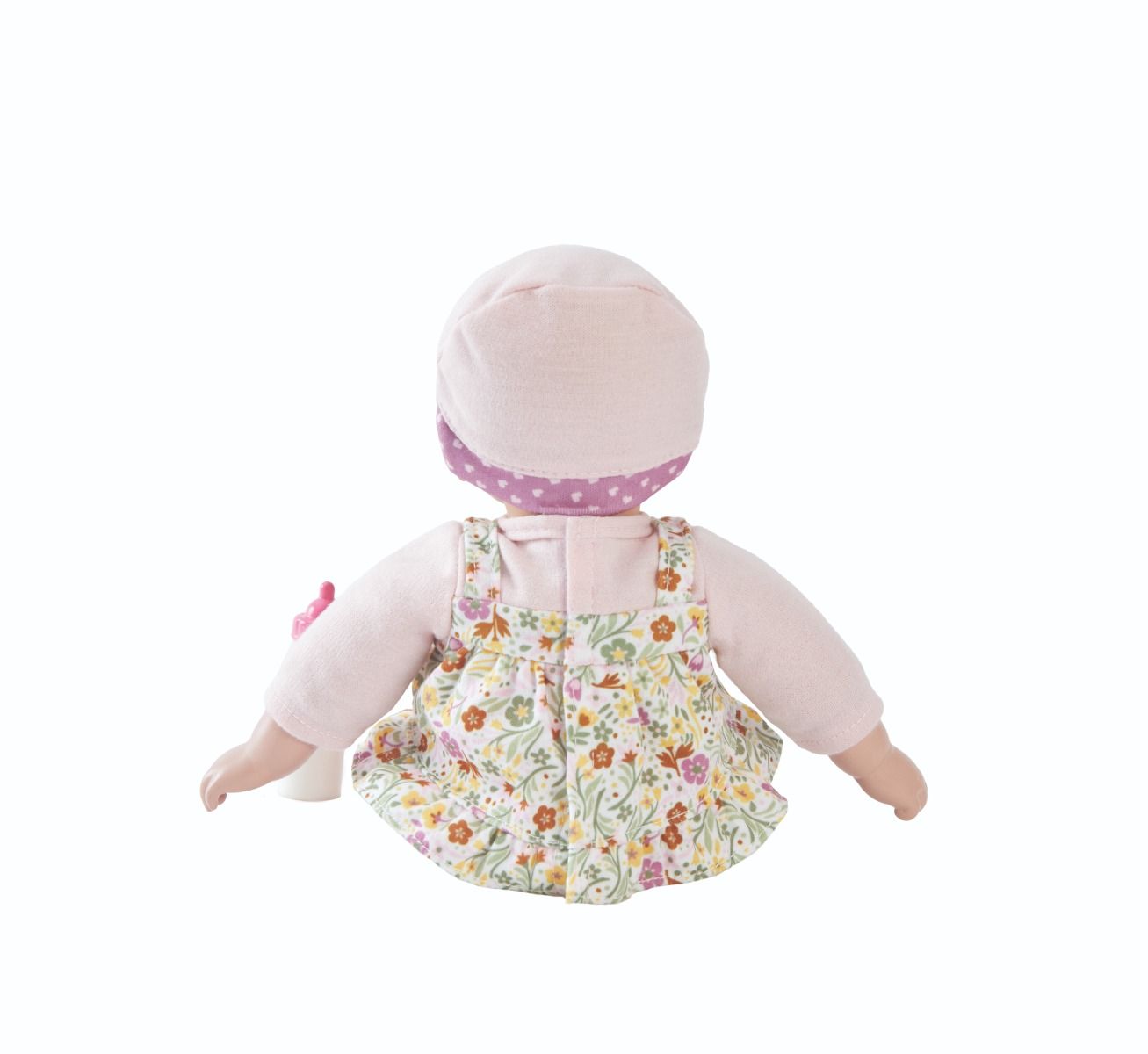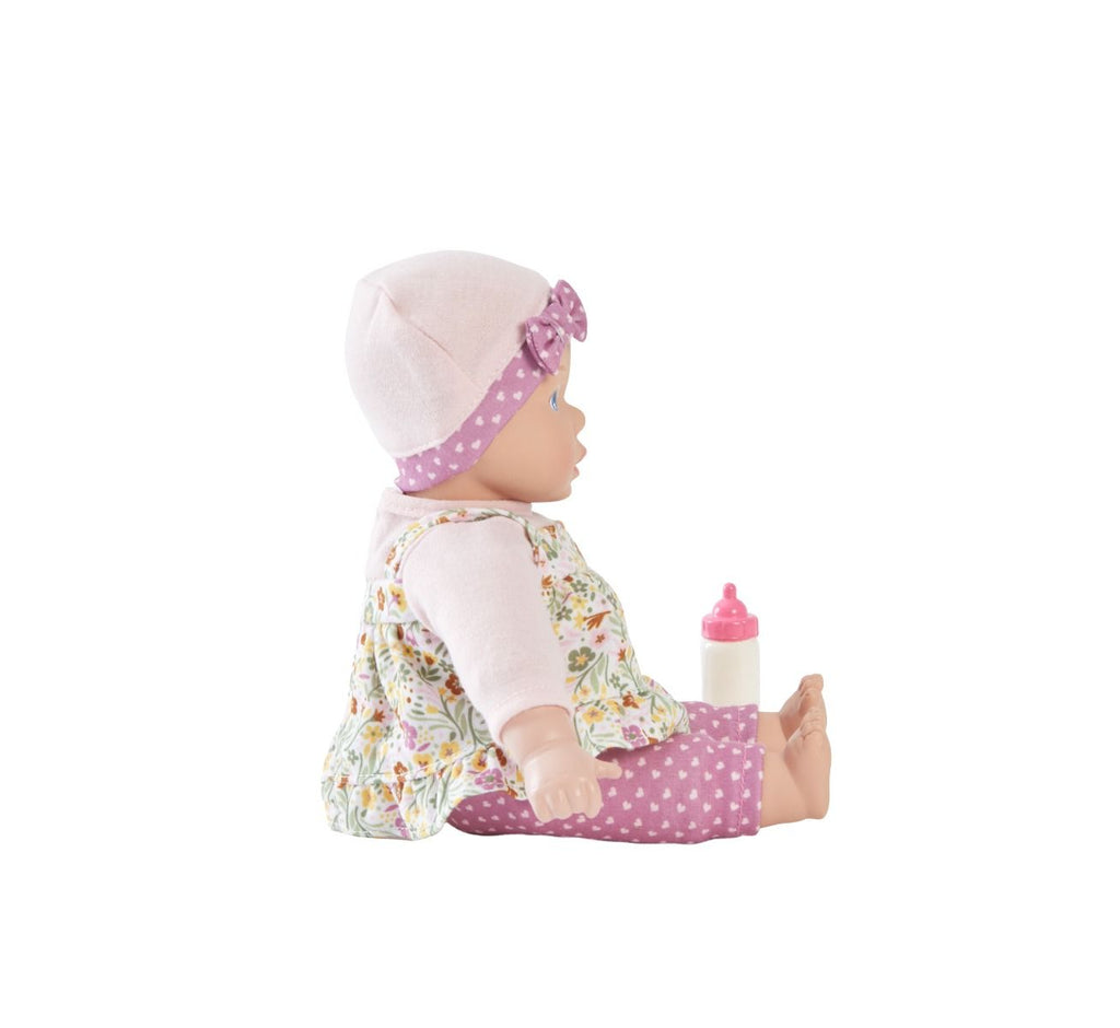 At 10 inches tall, this adorable, petite baby is just the right size to tote along on adventures! Soft-bodied and classically dressed, she is the perfect companion. A bottle included with each doll.