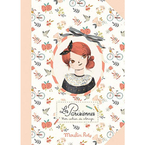 Colouring book with a delightful portrait of Madame Constance on the cover in pastel colours surrounded by a floral pattern and the Parisian world sketched in black, delicate and refined illustrations by Lucille Michieli.