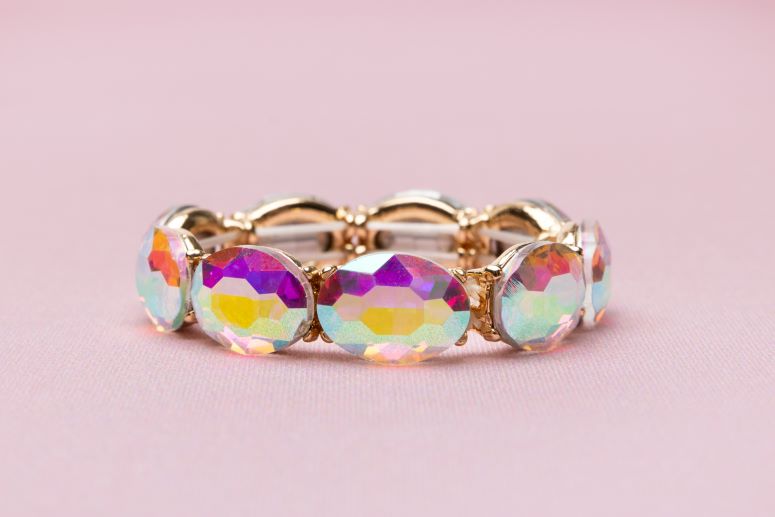 The New Boutique Chic Aurora Borealis Gem Bracelet features a mesmerizing array of gems that reflect a dazzling iridescent effect reminiscent of the Northern Lights. These gorgeous beads are strung together with an elastic for a size-flexible fit.