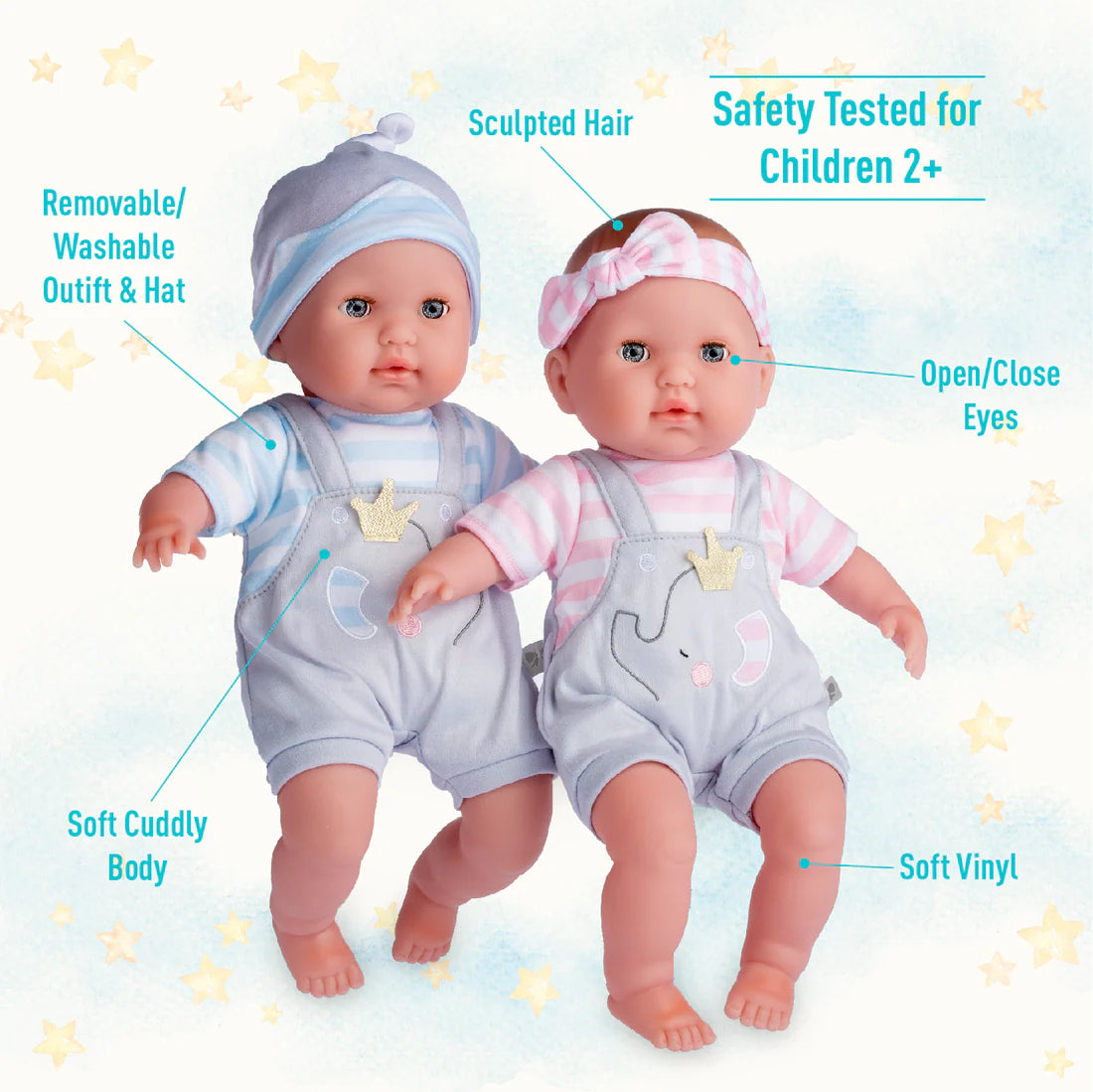 The Berenguer Boutique Twins Baby Dolls are 15 inches, they are the perfect first dolls for a child to learn what it’s like to take care of others. Baby dolls offer kids a way to develop their self-help skills because children are hands-on learners. Dolls teach children how to take care of another person, add and remove clothing, interact with small objects, and point out body parts (like eyes, ears, mouth, and nose).