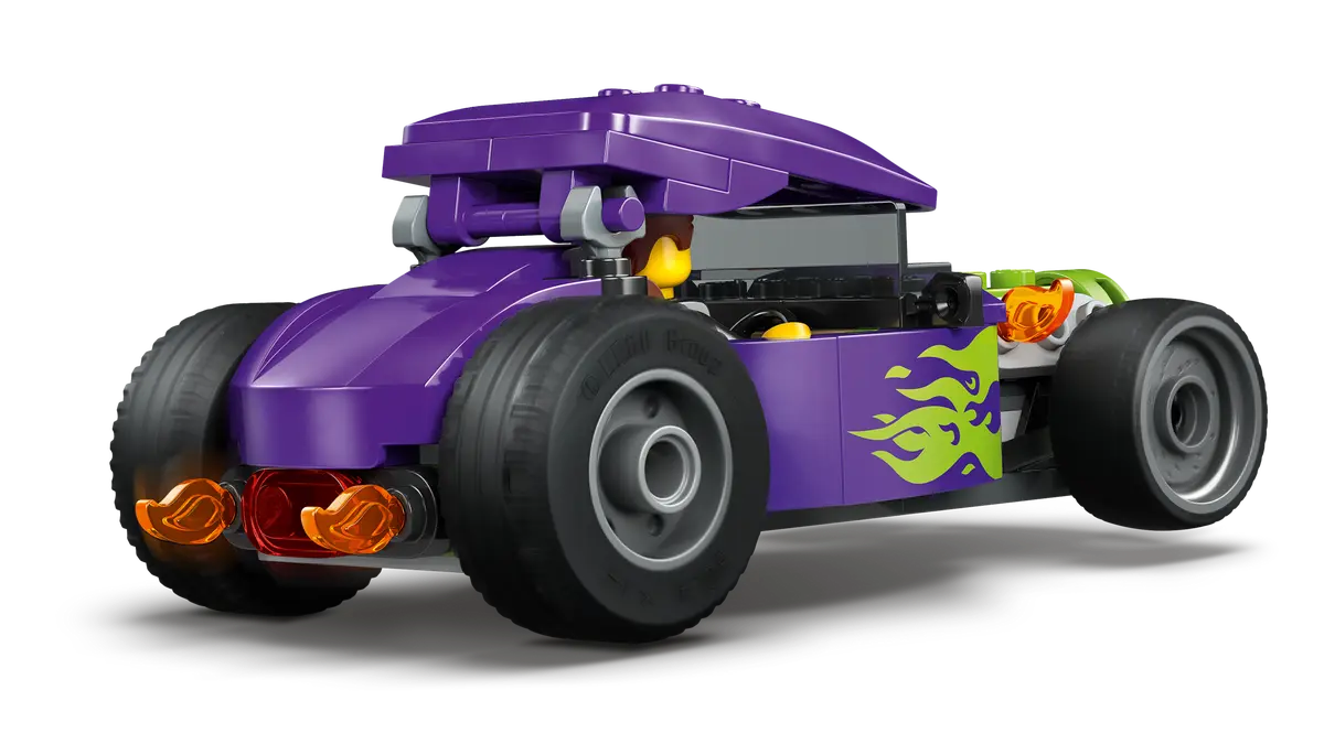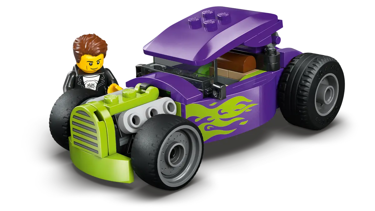 Young race car lovers ages 5 and up can buckle up for high-speed drag racing action with the LEGO® City Hot Rod car toy (60485). This model car building kit packs big thrills with detailed racing features including oversized rear tires, a driver cockpit with a lift-up roof, and a cool purple color scheme with neon green flames. Just add the driver minifigure for fast-paced pretend play. This small playset makes a great birthday gift or surprise treat for kids, boys and girls who love classic toy cars, building and imaginative storytelling. Add this set to others (sold separately) from the LEGO City range for more exciting race action. With this LEGO hot rod playset, kids can enjoy intuitive building with the LEGO Builder app, zooming and rotating with 3D instructions, while saving and tracking progress. Set contains 81 pieces.