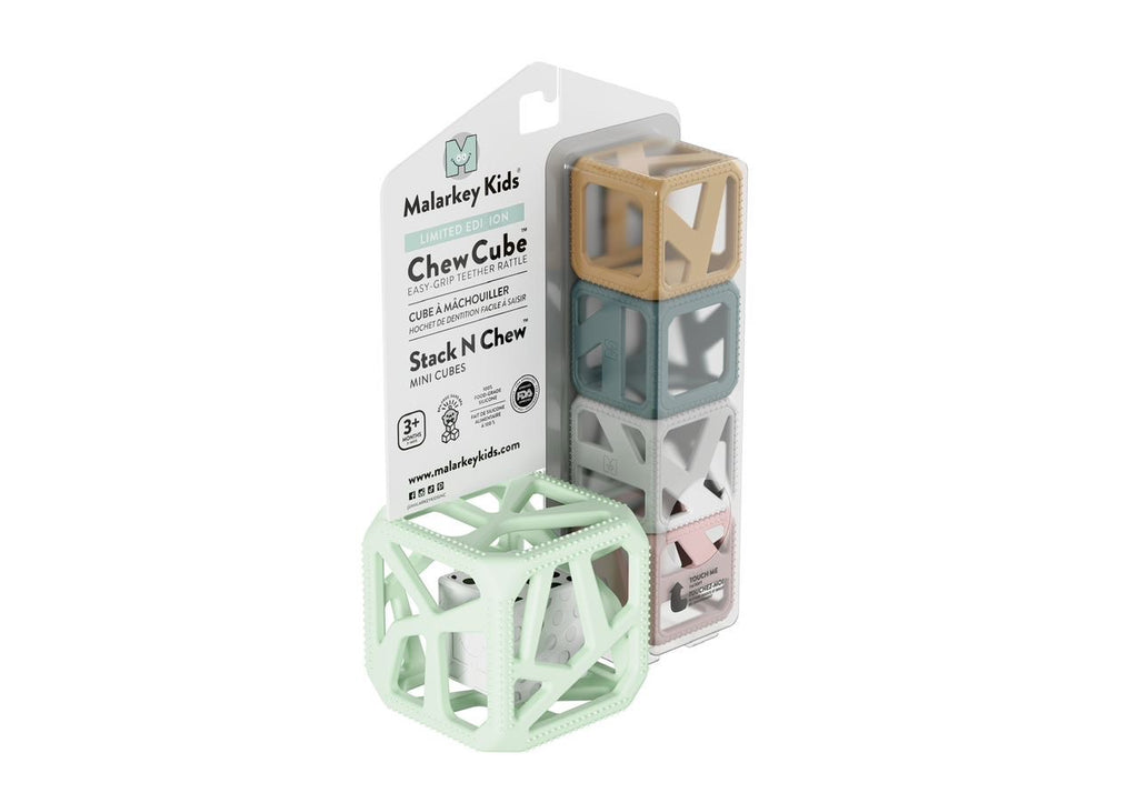 4 x Stack N Chew textured cubes made from food-grade silicone.