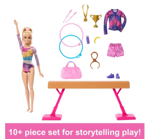 Kids will flip for this Barbie gymnastics playset with fashion doll, flipping feature and more than 10 accessories for fan-favorite events! Imaginations can create routines for the floor or balance beam and execute air moves with the c-clip mechanism -- simply snap onto the doll's waist for flips, cartwheels, jumps and more! Additional storytelling pieces includes batons, hoops, a trophy and a warm-up suit to really heat up the competition. With so much play opportunity, the Barbie doll and set makes a great gift for kids 3 years old and up. Doll cannot stand or flip alone. Colors and decorations may vary.
