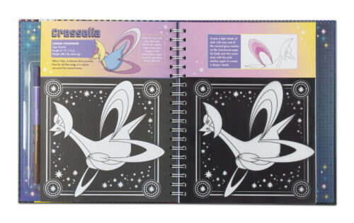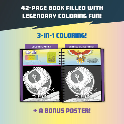 Special vellum paper lets you color in 18 pieces of Legendary Pokémon art that look like stained glass. Use the included double-tipped markers in 10 custom colors. Then hang your artwork in a window and watch it light up! There are three ways to color in this book. Color the stained glass vellum pages for your windows, and the paper pages for your walls. Then color the oversized bonus poster featuring even more Legendary Pokémon! Throughout the book, you'll find artsy tips and tricks, plus fun facts and stats about some of your favorite Legendary Pokémon, such as Lugia, Ho-oh, Rayquaza, Koraidon, Miraidon, and many more.