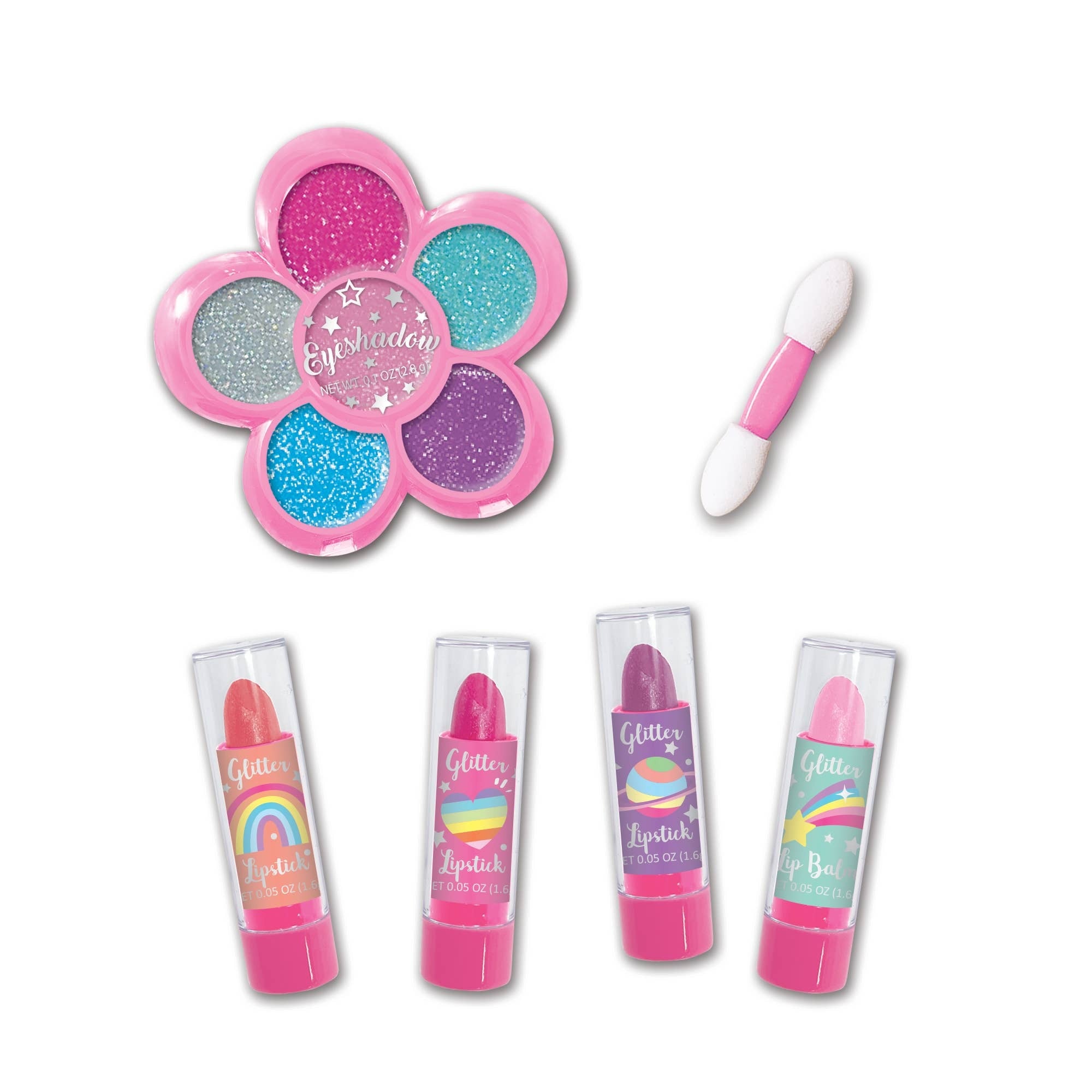 Shine like a diamond with glittery cosmetic fun! Contain: 4 Scented Glitter Mini Lipsticks 1 Glitter Eyeshadow Palette with applicator