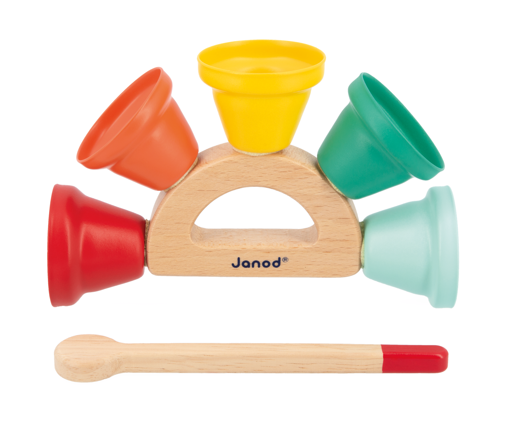 What 5 notes are these? Find out with the 5 Janod bells! This children’s musical toy can easily be grasped via its chunky wooden handle. Provided with a drumstick to strike the bells at will... many combinations are possible! This toy will introduce your child to the world of music whilst developing their hand-eye coordination. Wood is an early-learning musical toy for children aged 18 months and up.