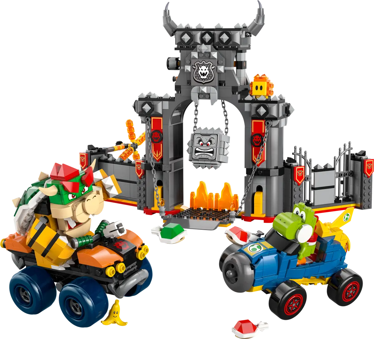 This building toy includes 4 LEGO Super Mario figures: Bowser, Yoshi, a Thwomp and a Lava Bubble. Add a LEGO® Mario™, LEGO® Luigi™ or LEGO® Peach™ figure (from sets 71439, 71440, 71441 or 72043 – sold separately) for interactive play, including Mario Kart sound/visual effects when they drive the vehicles. Explore the range of LEGO Super Mario: Mario Kart toy playsets (sold separately) for more vehicles and characters to expand the fun. This set contains 1,068 pieces.