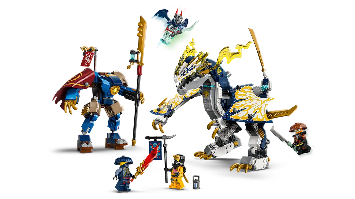 Rogue’s Mech Dragon Rider (71843) combo ninja toy lets boys and girls aged 8 plus enact tales from season 3 of the NINJAGO® Dragons Rising TV show. Kids can separately play with a mech toy and the first-ever NINJAGO robot dragon toy before combining them into the awesome Rogue’s Mech Dragon Rider.
