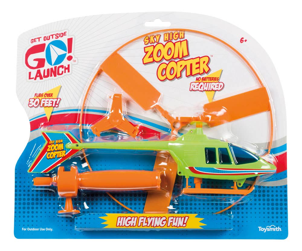 The Sky High Zoom Copter comes in a fun, bright green and orange color combination, and is made with high-quality, nontoxic materials. Each helicopter toy is authentically designed and can fly 30 feet high. No batteries required. A launcher with ripcord mechanism powers helicopter flights. Product is individually packaged in a peggable see-through blister packet.