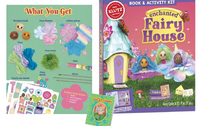 Make a little mini magic! Bring three whimsical fairy dolls to life. Mix and match colorful glitter skirts, wooden beads, flowing yarn hair, and faux flowers to design and dress the fairies with twisted wire and glue. Build their home and decorate it with teeny furniture, enchanted flowers, and faux moss. Finally, cut and bind an illustrated, fairy-sized storybook featuring your three fairies on a rhyming adventure.
