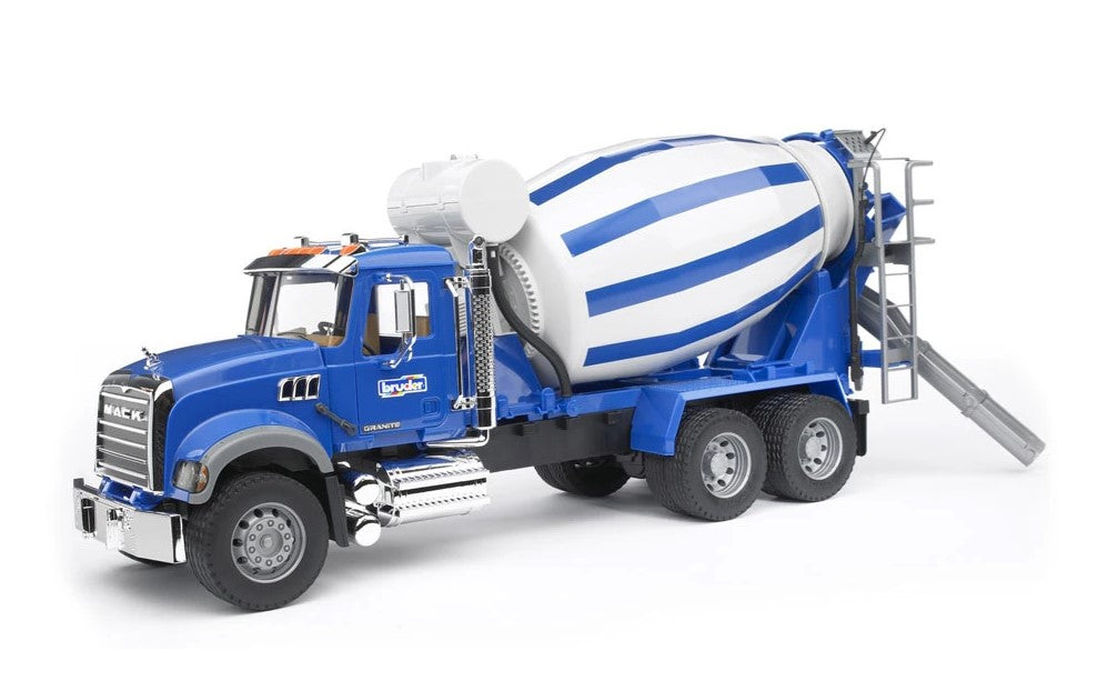 The "incredibly" realistic driver's cabin with its doors that can be opened, the tilting engine bonnet, providing a view of the engine block, the foldable rear-view mirrors, and the many add-on accessories, which give it a chrome look, make this truck a true feast for the eyes of every truck fan. The cement mixer barrel (barrel with mixing spiral) can be turned by a fold-out crank handle that is lowered into the "water tank" (dummy). Depending on its direction of rotation, the goods will be loaded into or transported out of the barrel. The chutes attached to the sides of the assembly can be slipped over the rear concrete chute.