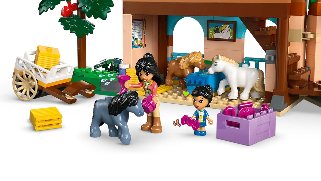 Kids can create endless adventures with characters Aliya, Liann, Victoria and Ella. Grooming and feeding the 3 ponies is lots of fun and there’s a working hay elevator to move hay bales into the hayloft or onto the cart. Inside the ranch, there’s a cozy living area, plus the hayloft where the friends love to sleep above the stable – it’s a horse-lover’s dream come true!