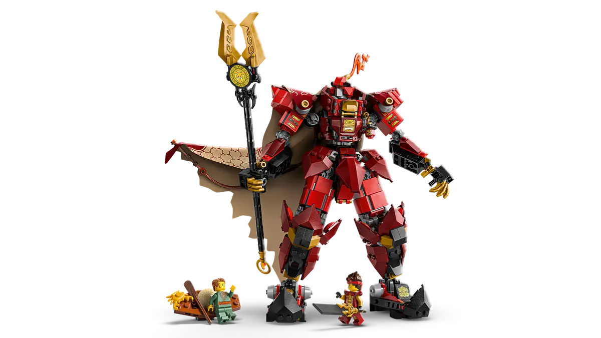 Ninja fans can also remove the model from its base to recreate stories from the NINJAGO Legends Monstrosity series. The mech has posable features and the sea monster has movable tentacles. The model also comes with 2 NINJAGO minifigures: Kai with a magical sword, who can be placed inside the mech’s chest, and a fisherman with a paddle in a boat.